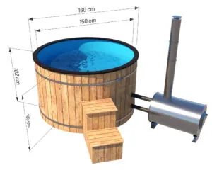 Balia o średnicy 160 cm została ręcznie wykonana z Thermo Drewna. Wyposażona jest w plastikowy wkład całkowicie zapobiegający przeciekaniu oraz blaszany piec z szybą i termometrem, służący do podgrzewania wody.