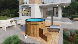 Balia ogrodowa 160 cm o pojemności 1000 litrów pozwoli na miły relaks w towarzystwie bliskich i przyjaciół, ponieważ rozmiar umożliwia korzystanie aż 4 osobom. Do balii 160 cm można wejść po drewnianych schodkach, a następnie usiąść na wyprofilowanym siedzisku. Po kąpieli możliwe jest zabezpieczenie balii drewnianą pokrywą dołączoną do zestawu.