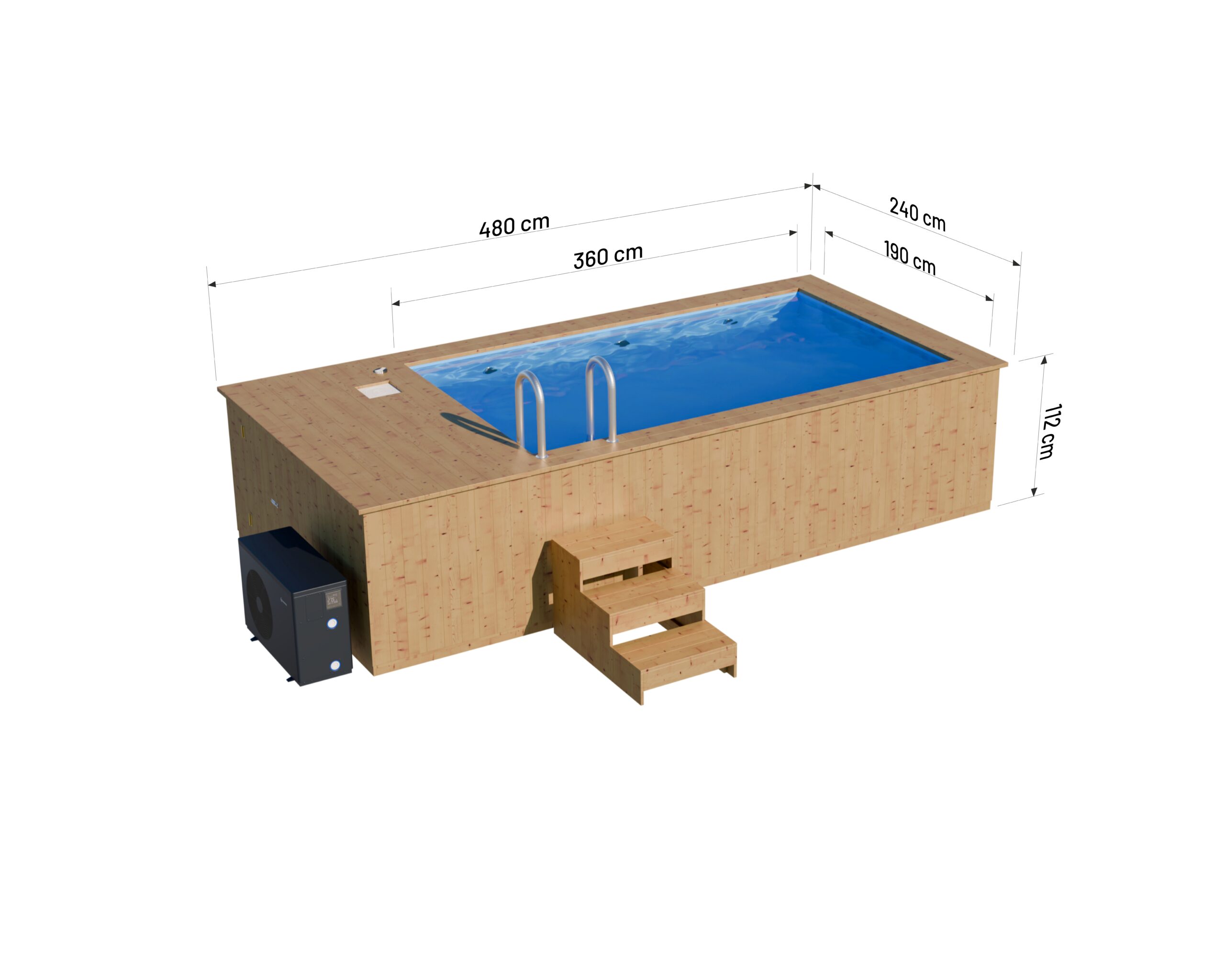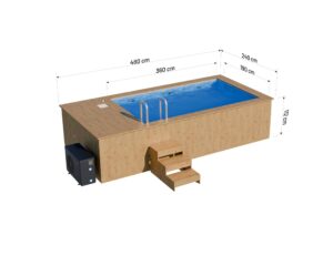 Wymiary basenu to 480 x 240 cm. Deski obudowy basenu posiadają 44 mm grubości. Drewno odporne – poddane procesowi termowania. Pojemność 6840 litrów.