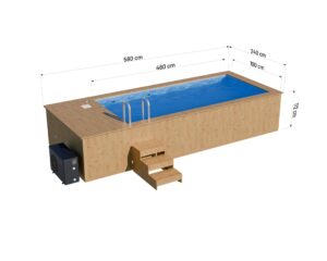Konstrukcja naszych drewnianych basenów została zaprojektowana tak, by mogła przetrwać lata użytkowania. Z racji zastosowania w nich 44 mm desek sosnowych Thermo, które przeszły proces suszenia komorowego, są one wyjątkowo odporne na zmienne warunki atmosferyczne. Kompaktowy rozmiar basenu 580 × 240 cm pozwala na pomieszczenie 10000 litrów wody, co sprawia, że jest idealny dla kilku osób.