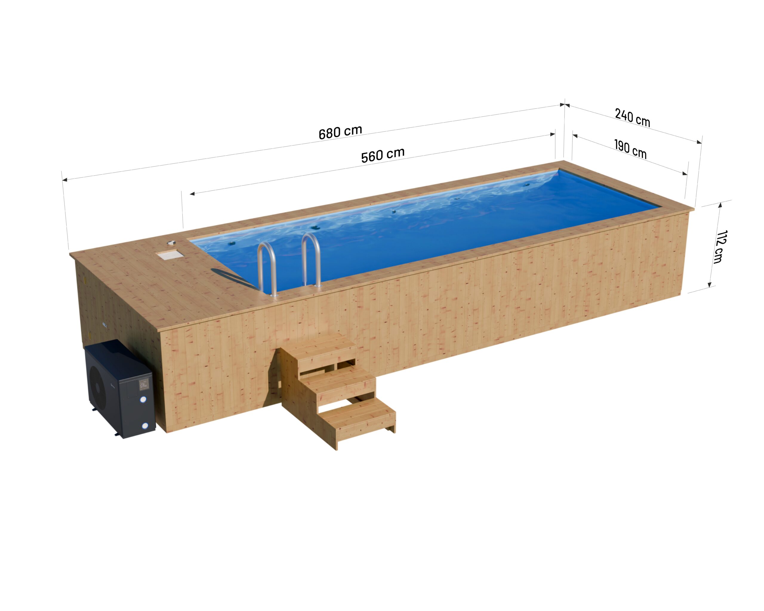 Konstrukcja naszych basenów drewnianych została zaprojektowana tak, aby służyły przez wiele lat. Są zbudowane z desek sosnowych Thermo o grubości 44 mm, które przeszły proces suszenia komorowego. To sprawia, że są całkowicie odporne na wilgoć i odkształcenia pod wpływem czynników zewnętrznych. Kompaktowy rozmiar 680 × 240 cm pozwala na pomieszczenie 12000 litrów wody, co gwarantuje komfortową kąpiel dla kilku osób.