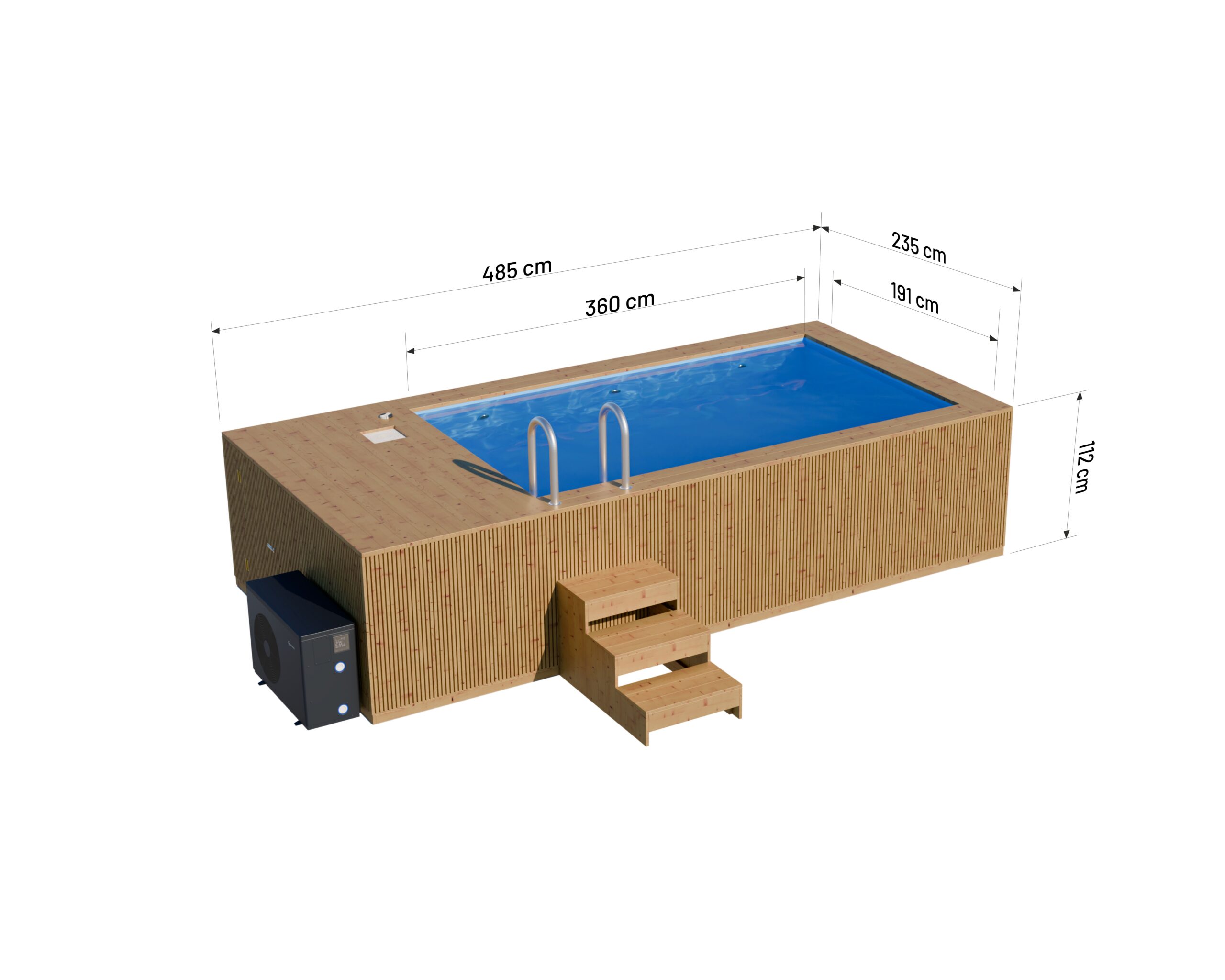 Wymiary basenu to 485 cm x 235 cm. Drewno odporne – poddane suszeniu komorowemu oraz procesowi termowania. Pojemność 6840 litrów.