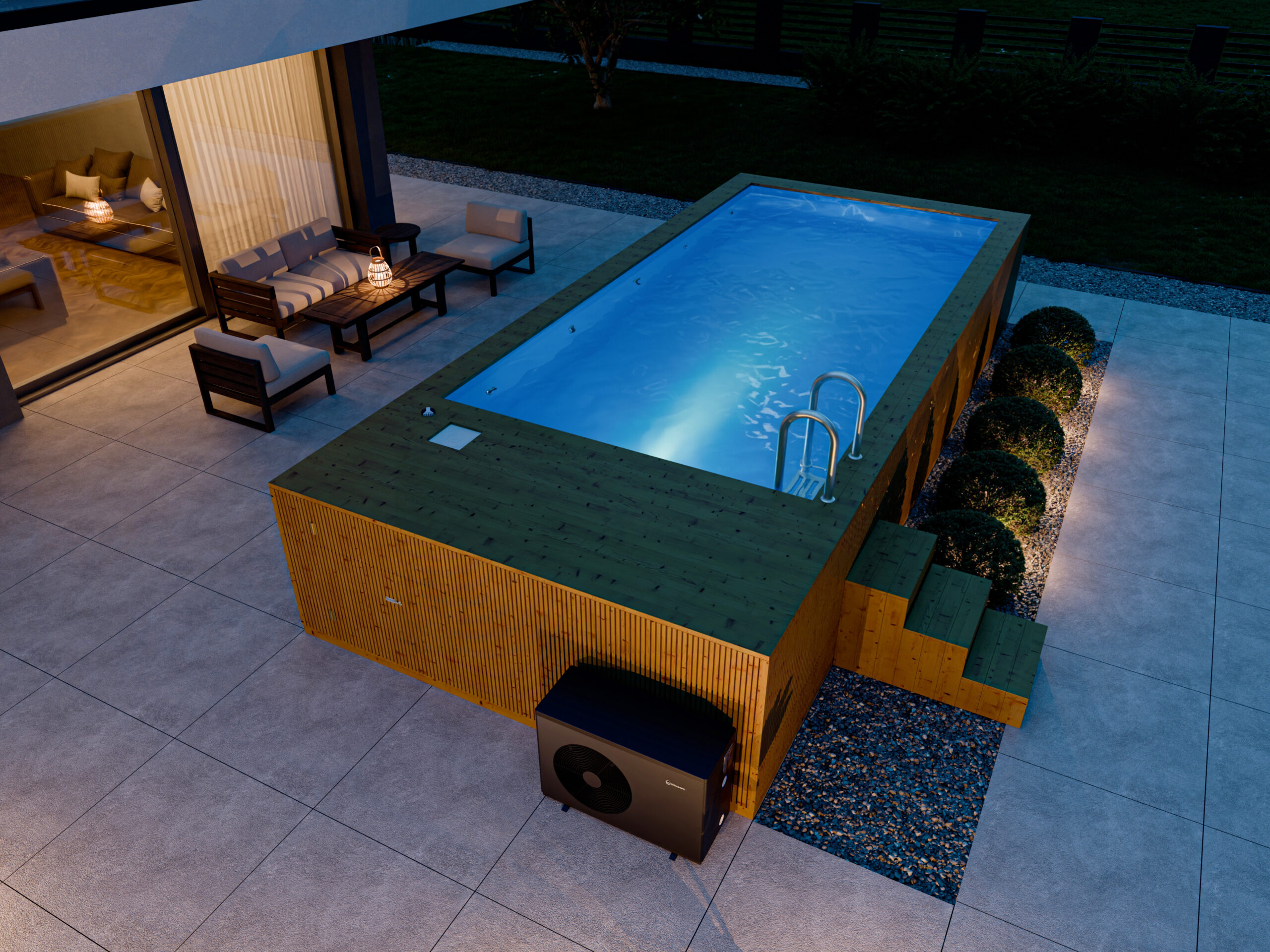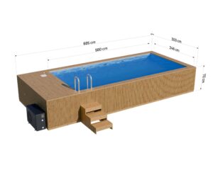 Wymiary basenu to 685 cm x 300 cm. Drewno odporne – poddane suszeniu komorowemu oraz procesowi termowania. Pojemność 14000 litrów.