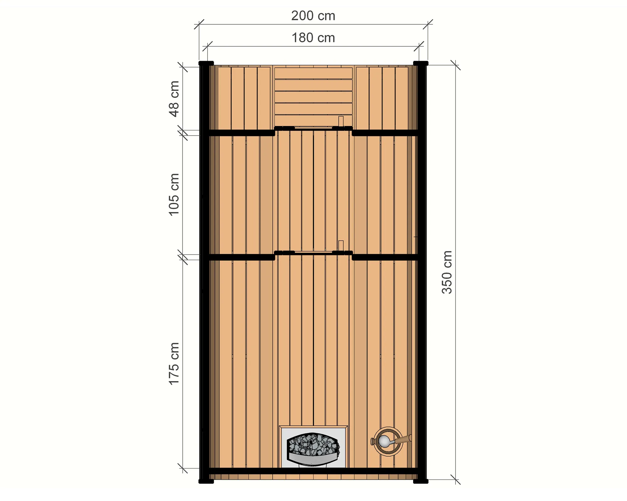 Sauna wykonana z drewna świerkowego i desek o gr. 45 mm, posiada przedsionek z ławkami oraz przestronne wnętrze. Wym. sauny 350 cm dł. i 200 cm wys. W środku ławki i podłoga. Drzwi z szybą ze szkła hartowanego. Nasze sauny dodatkowo zabezpieczone są gontem bitumicznym, co stanowi skuteczną ochronę przed niekorzystnymi warunkami atmosferycznymi. To praktyczne rozwiązanie, które podnosi trwałość sauny i utrzymuje ją w doskonałym stanie przez długi czas. Do tego 4 metalowe obejmy spinające i 3 podstawy z drewna.