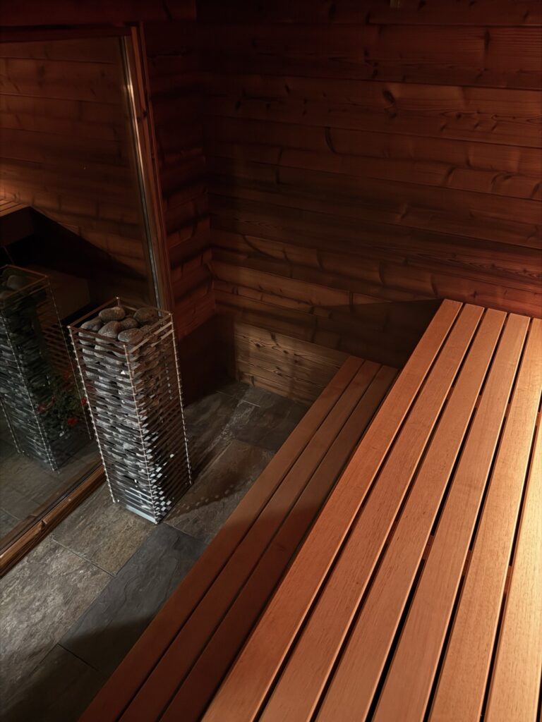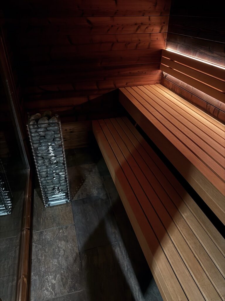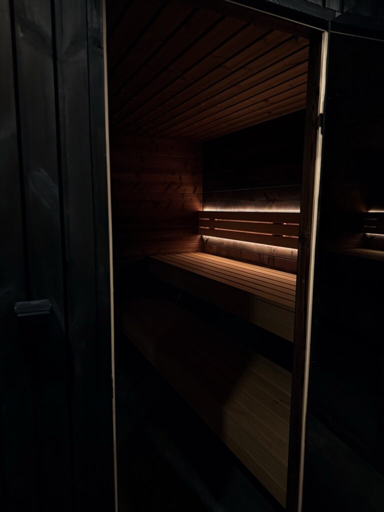 Sauna została wyposażona również w nowoczesne oświetlenie ambientowe LED wewnątrz i zewnętrzne podświetlenie tarasu, które tworzy wyjątkowy nastrój, nawet po zmroku.