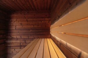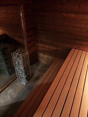 Wnętrze sauny zostało zaprojektowane z myślą o maksymalnym komforcie użytkowania. Znajdziesz tu dwupiętrową, lewitującą ławę wykonaną z drewna Abachi, które jest niezwykle przyjemne w dotyku i odporne na wysoką temperaturę.