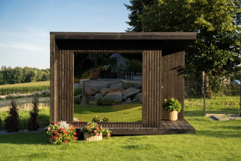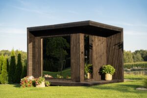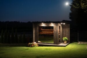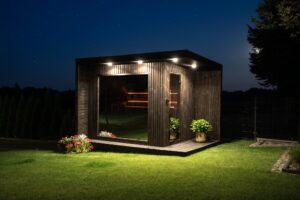 Sauna idealnie wpisuje się w aranżacje nowoczesnych ogrodów, tarasów i stref relaksu przy domach lub domkach wypoczynkowych.