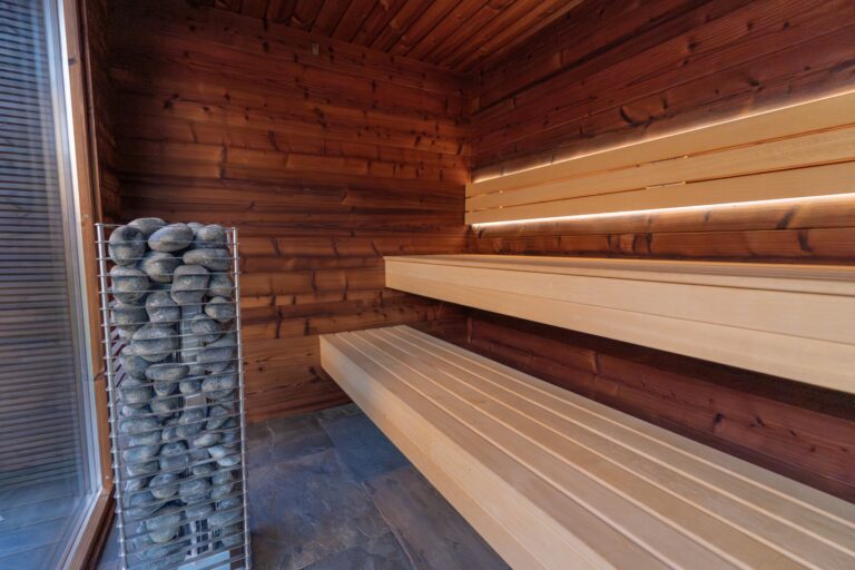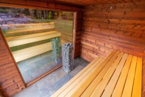 Dzięki zastosowaniu wielowarstwowej izolacji (wełna skalna i mineralna), sauna skutecznie utrzymuje ciepło i pozwala na komfortowe korzystanie przez cały rok.