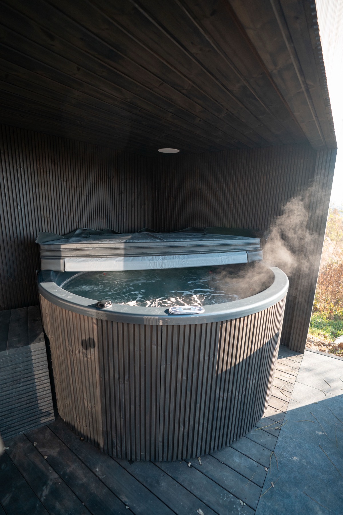 Całość prezentuje się niezwykle elegancko: minimalistyczna architektura, wysokiej jakości materiały, starannie dobrane detale i harmonijne połączenie z otoczeniem sprawiają, że przestrzeń relaksu nabrała wyjątkowego charakteru. Sauna działa bez zarzutu, jacuzzi zapewnia pełen komfort, a balia z zimną wodą idealnie dopełnia rytuał regeneracji.