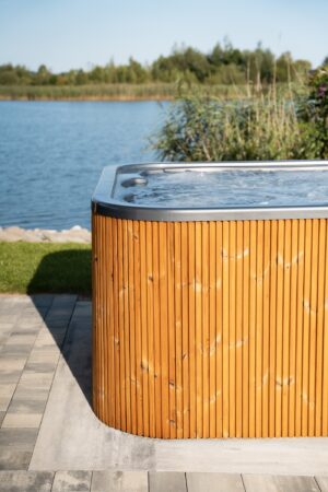 Zintegrowane drewniane schody ułatwiają dostęp do niecki, a termoizolacyjna pokrywa pomaga w utrzymaniu ciepła i ogranicza straty energii.